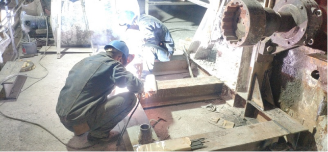 8)回轉(zhuǎn)窯輪帶擋圈及墊板補(bǔ)焊加固,檢查大齒圈齒面磨損并對(duì)齒面打磨修復(fù)(未完成);