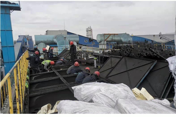 “兵分兩路,烈日前行”。5月22日早晨8:30,30多人開始在除塵系統(tǒng)頂部開始舊布袋和袋籠的拆除工作!耙粋布袋長4.2米,全部堆到這兒,對平臺上的作業(yè)人員很不安全,我們還是把布袋疊好,放在大袋子中,這樣現(xiàn)場就不亂了。”幾名女職工及時規(guī)整舊布袋。