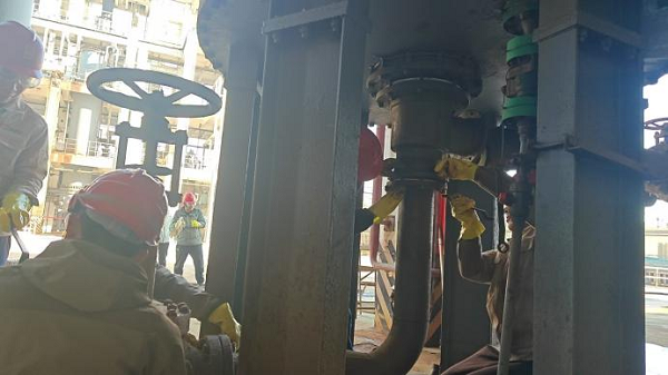 今天,我們的主要任務(wù)是對一期合成爐進(jìn)行檢修。合成爐作為氯化氫崗位生產(chǎn)的核心設(shè)備,宛如一位不知疲倦的巨人,日夜不息地運(yùn)轉(zhuǎn)著。然而,長時(shí)間的高強(qiáng)度作業(yè),讓它也不免留下了歲月的痕跡。由于長時(shí)間運(yùn)行,合成爐安全附件燈頭內(nèi)的氯化物增多,因此必須將其拆卸下來,更換墊子并清理內(nèi)部的氯化物。