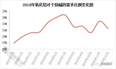 根據(jù)卓創(chuàng)監(jiān)測(cè),2018年氧化鋁對(duì)于燒堿的需求占比達(dá)到33%-34%,如上圖所示,2018年大多數(shù)月份氧化鋁行業(yè)對(duì)燒堿需求比例均超過30%,其中個(gè)別月份最高需求占比達(dá)到35.81%左右,最少的月份需求占比也在27%左右。毫無疑問,氧化鋁是目前燒堿下游需求行業(yè)中的“頂梁柱”般的存在,對(duì)燒堿市場(chǎng)起到明顯剛性需求支撐,是燒堿行業(yè)最值得信賴的需求點(diǎn)。