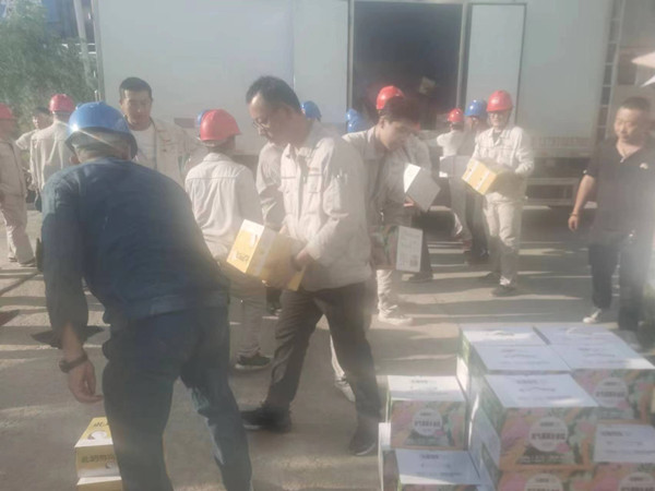 工作人員將防暑品送到生產(chǎn)一線,將濃濃關(guān)愛送到員工們手中,員工們?cè)诳釤岬南奶烊顼嫺嗜,神清氣爽?