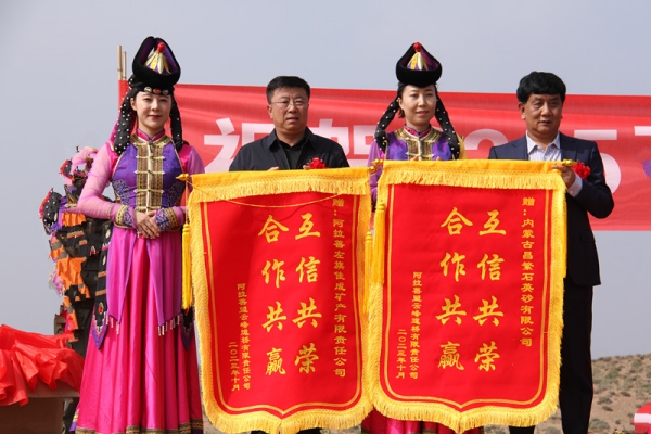活動(dòng)中,阿拉善盟云峰道橋有限責(zé)任公司為寧夏金昱元集團(tuán)公司等合作單位頒發(fā)旌旗。